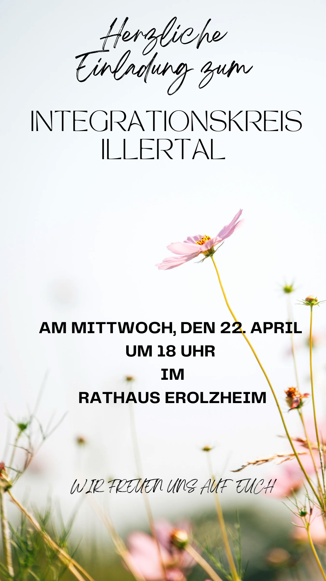 Herzliche Einladung zumINTEGRATIONSKREIS ILLERTALAM MITTWOCH, DEN 22. APRIL UM 18 UHRIMRATHAUS EROLZHEIMWIR FREUEN UNS AUF EUCH